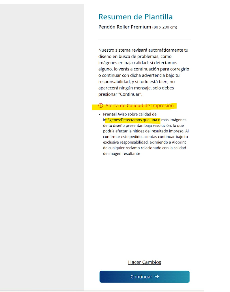 En caso de continuar, la impresión será realizada bajo tu exclusiva responsabilidad, aceptando la calidad de imagen mostrada al momento de crear tu diseño.